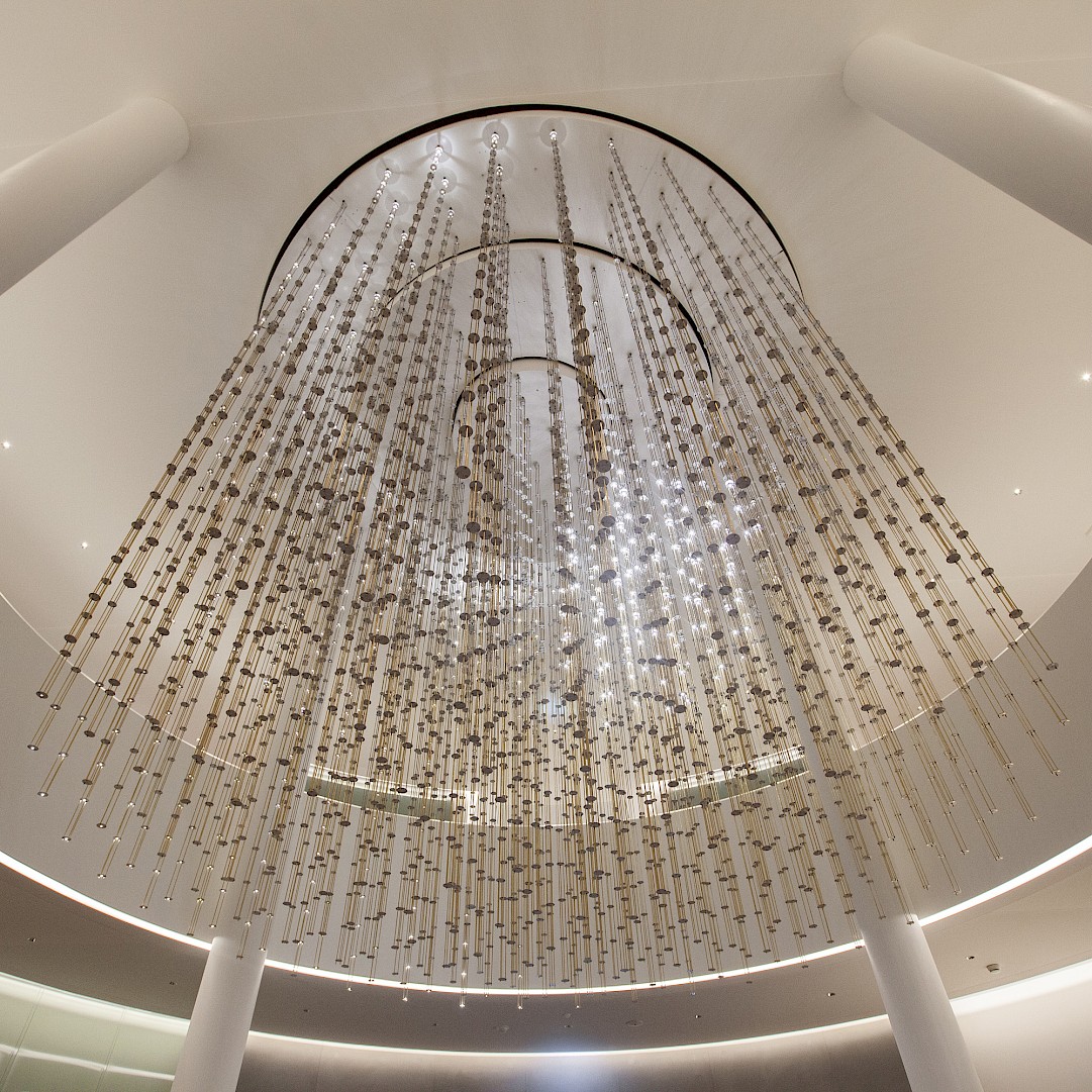 Parhélie, une sculpture lumineuse simulant l’effet de scintillement sur le lac selon les données météo de Genève pour l’entrée de la BCGE