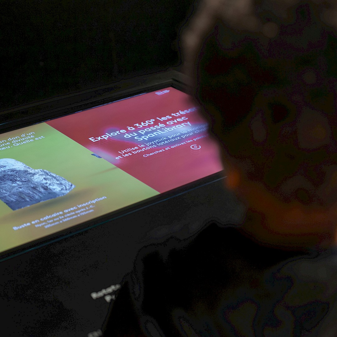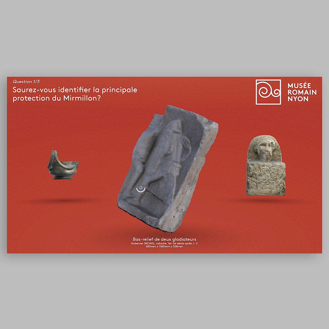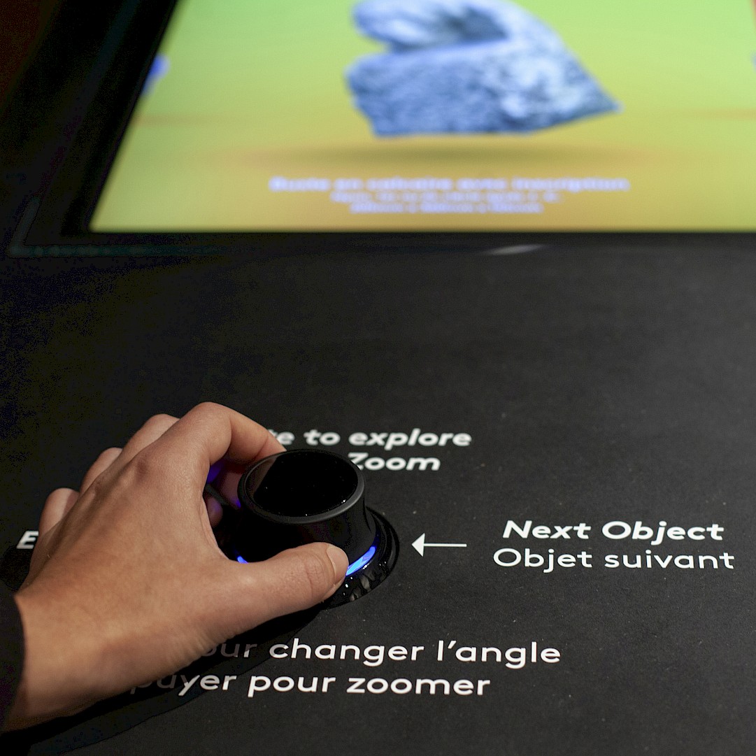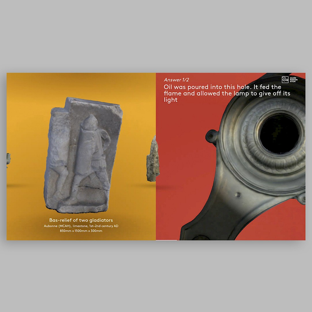 The interface is split into two, allowing two players to experience it simultaneously using joysticks to zoom, rotate the objects 360°, and explore points of interest. In a playful way, the interface asks visitors questions and invites them to search for specific details on the objects; when a point of interest is activated, a part of the object is highlighted and accompanied by an explanation.