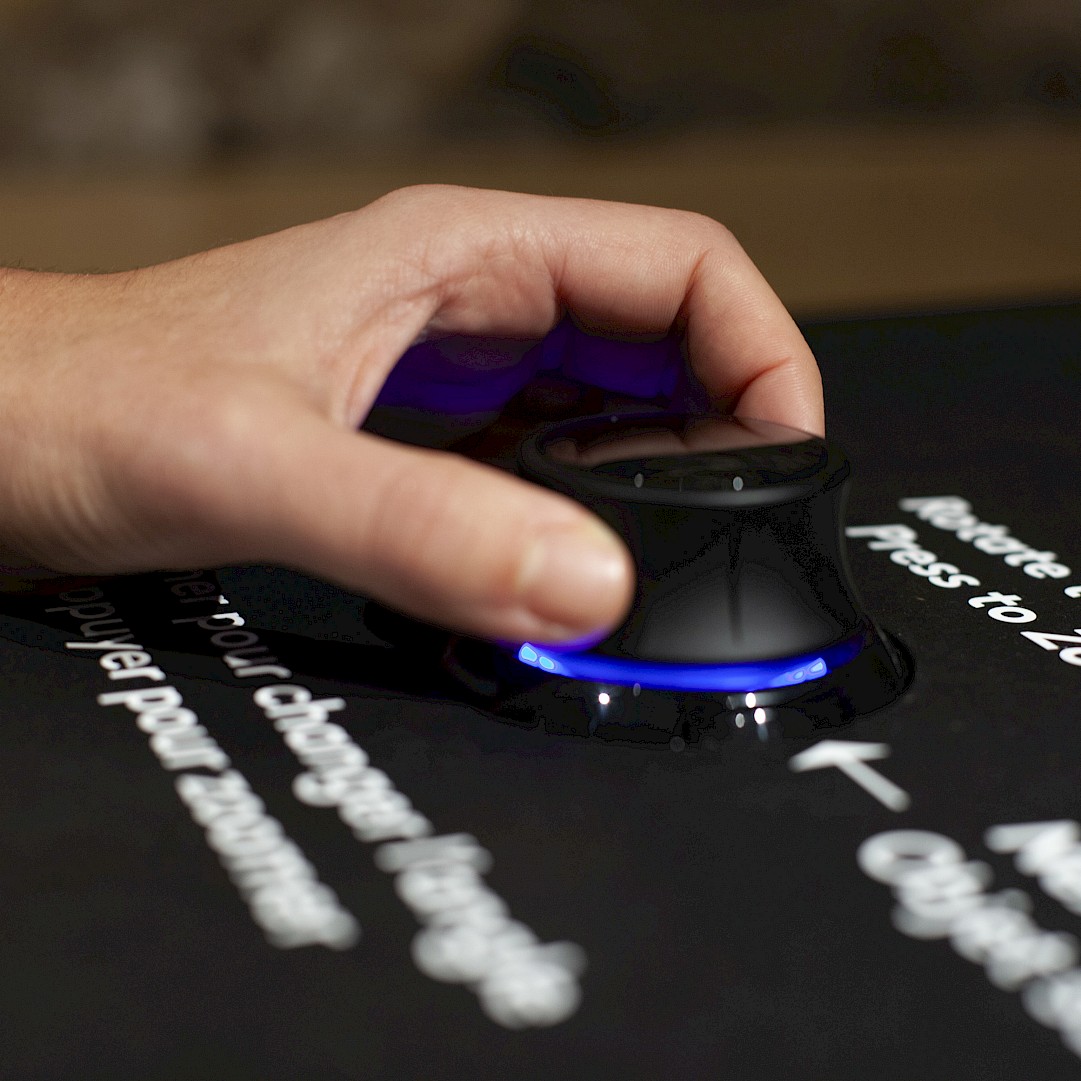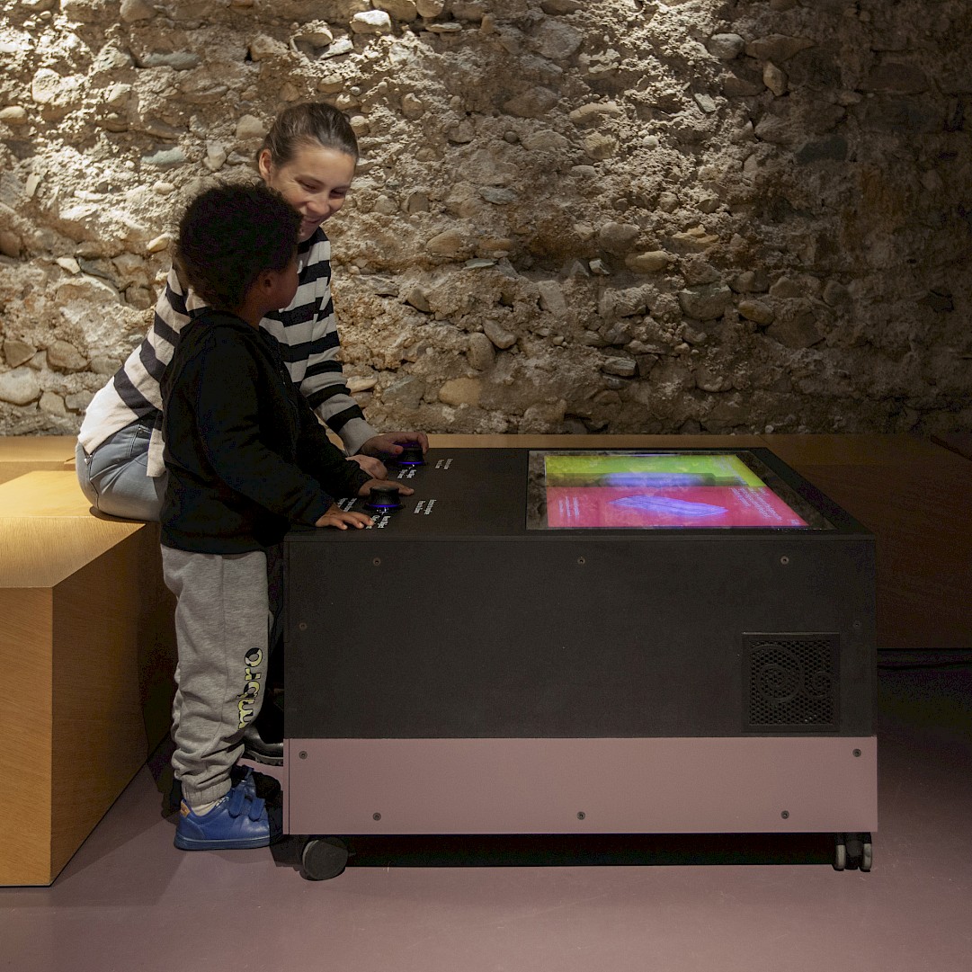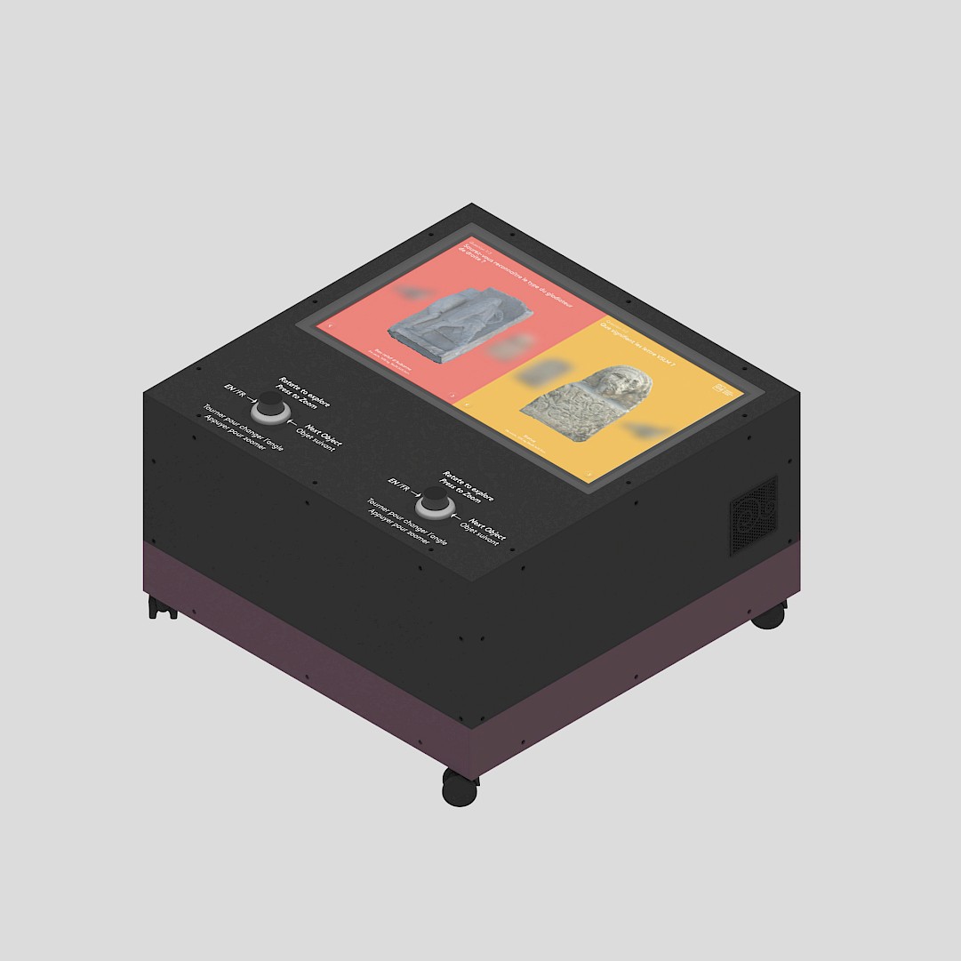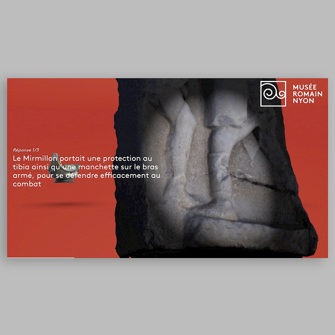 The interface is split into two, allowing two players to experience it simultaneously using joysticks to zoom, rotate the objects 360°, and explore points of interest. In a playful way, the interface asks visitors questions and invites them to search for specific details on the objects; when a point of interest is activated, a part of the object is highlighted and accompanied by an explanation.