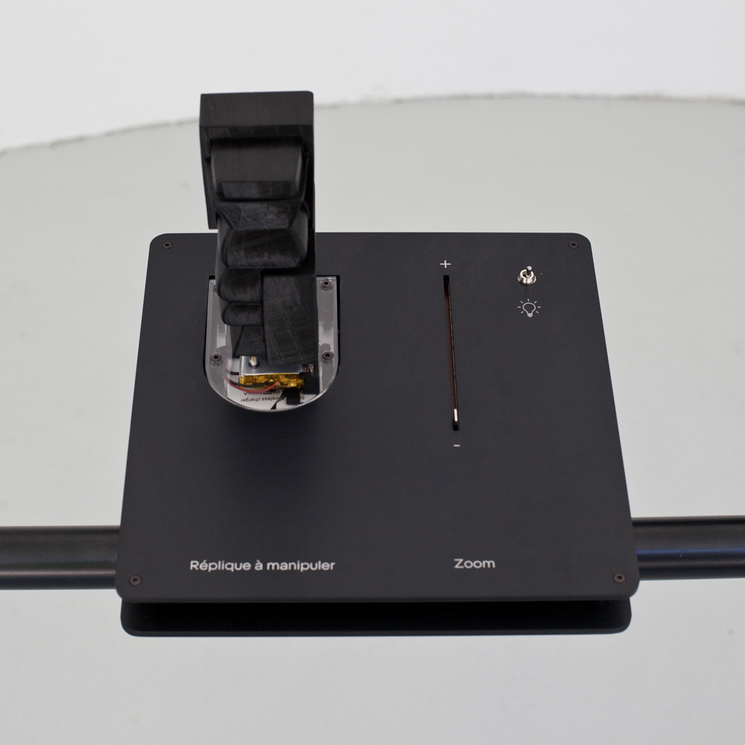 By manipulating 3D printed miniatures, visitors can interact on screen with the digitized artwork, exploring it from every angle to reveal the details of its shape and texture. Various types of interaction are possible thanks to physical controllers such as the slider for zooming or the switch to vary the interface's lighting ambience.