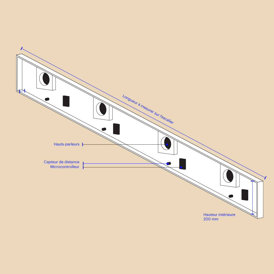 We were commissioned by the Musée d'Histoire Naturelle in Neuchâtel to create an interactive sound installation for their year-long exhibition about the North and South Poles entitled "Pôles, feu la glace". The installation takes place in a staircase of fifteen steps that opens the exhibition. A wooden plinth containing fifteen distance sensors and speakers is fixed on the lower part of the handrail.