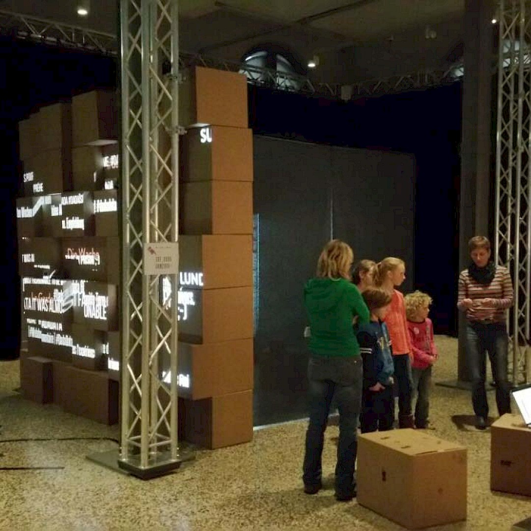The user manipulates a cardboard box, in which she positioned her smartphone. Placed in front of a projected screen, this box, recognised by a camera, becomes the head of the puppet. Around the puppet, specific information about the user appears; photographs, images, links, memories and forgotten information.